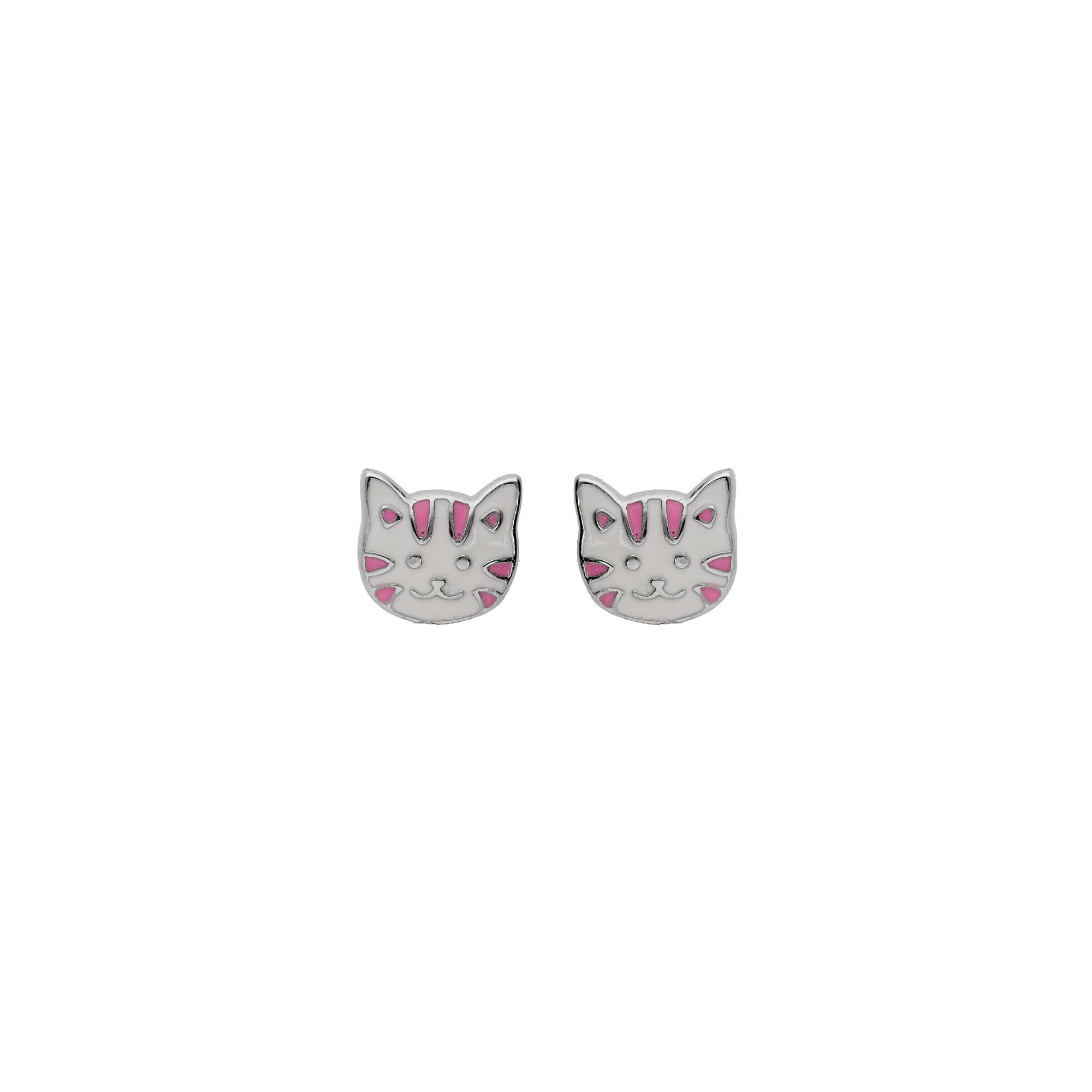 Boucles d'oreilles tige argent rhodié tête chat résine blanc et rose