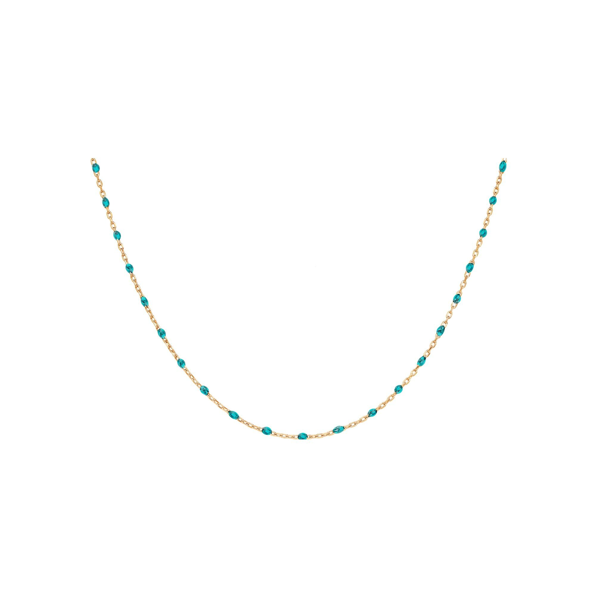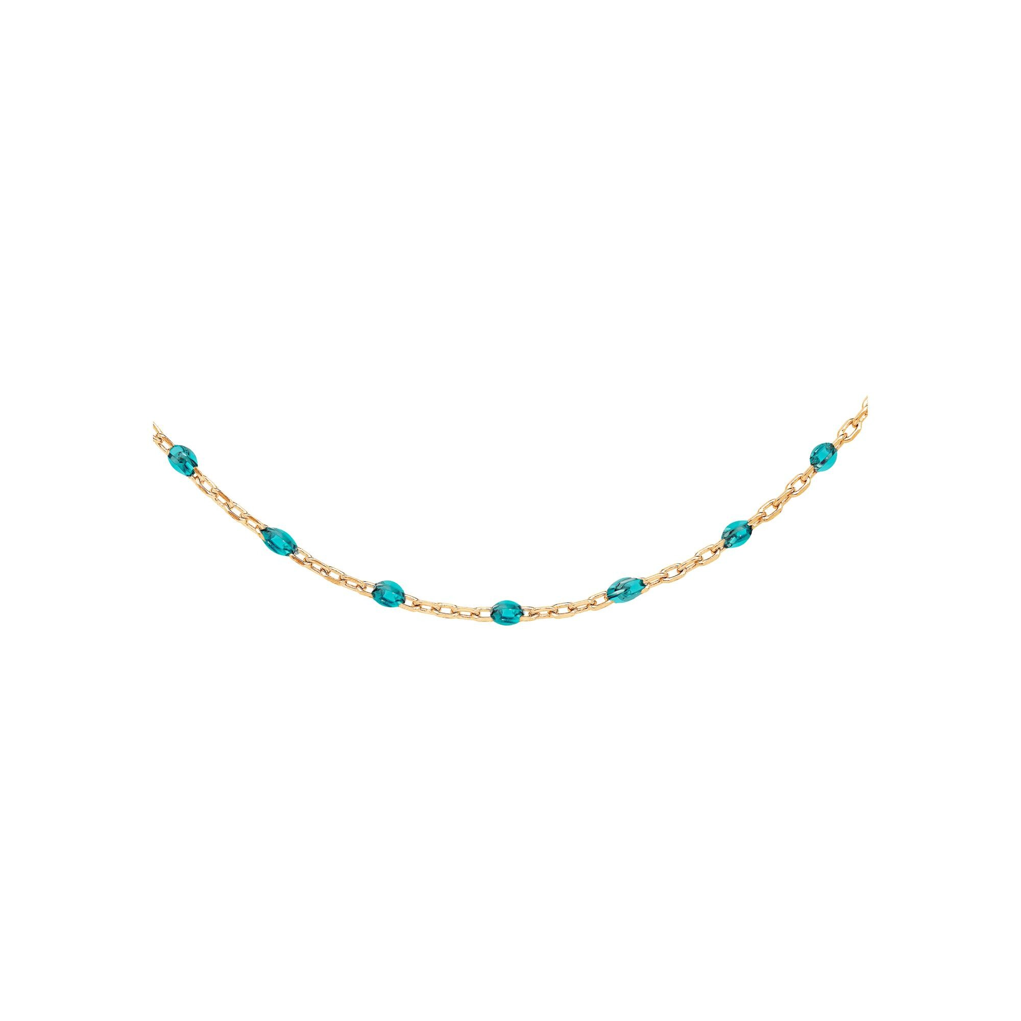 Collier argent et dorure jaune olives résine bleu transparent 40+5cm